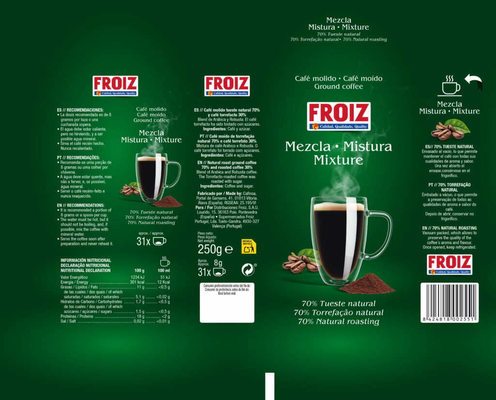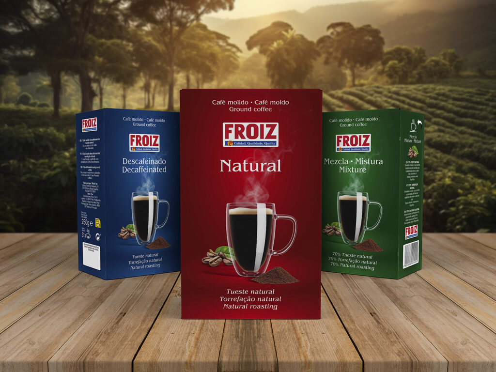 El reto era doble: mantener la diferenciación entre las tres variedades (Natural, Mezcla y Descafeinado), y al mismo tiempo construir una imagen de familia coherente, reconocible y alineada con los valores de Supermercados Froiz.