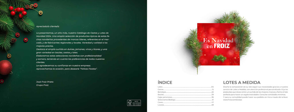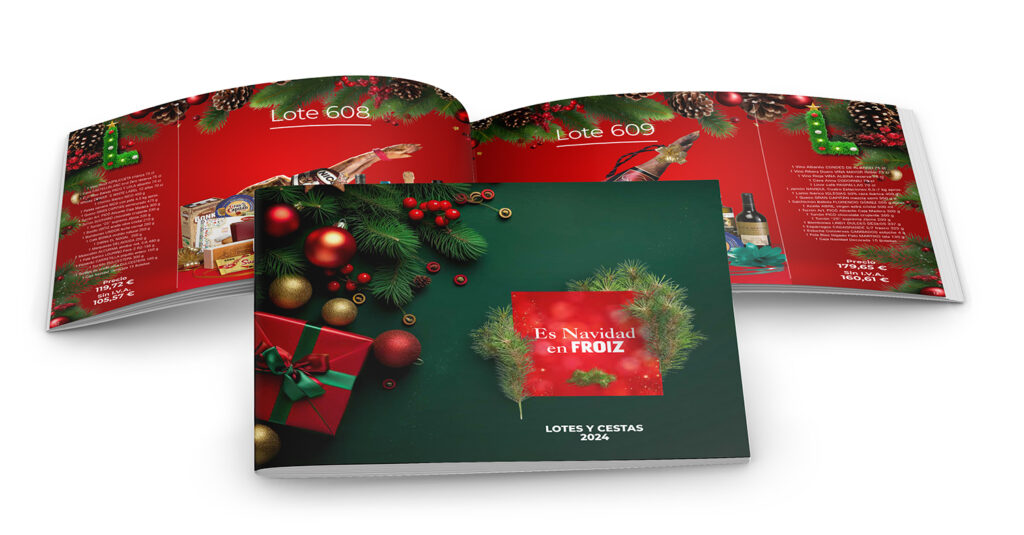En portada, el mensaje “Es Navidad en Froiz” se convierte en el eje emocional del catálogo. Una declaración directa y acogedora que conecta con el cliente desde el primer vistazo. En el interior, cada lote está cuidadosamente fotografiado y descrito, respetando el equilibrio entre imagen y texto para reforzar su aspecto aspiracional y práctico a la vez.