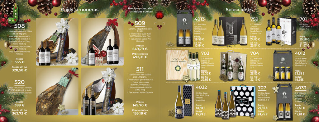 El reto de este año fue actualizar el diseño sin perder la esencia navideña ni la coherencia visual con años anteriores. Apostamos por un diseño sobrio pero festivo, con predominancia de fondos verdes oscuros y rojos intensos, reforzados por elementos decorativos tradicionales como piñas, bolas, lazos y ramas de abeto. Todo ello acompañado de una maquetación limpia y ordenada, que facilita la lectura y da protagonismo a los productos.
