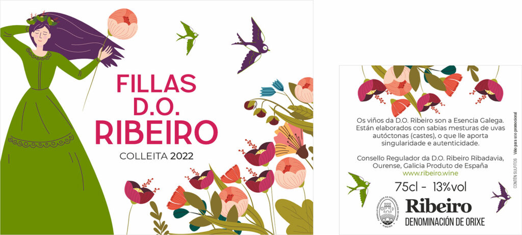 A partir de ese guiño cinematográfico, construimos una propuesta gráfica fresca, alegre y profundamente gallega. La ilustración principal muestra una figura femenina vestida de verde —símbolo de naturaleza, fertilidad y territorio muy viculado al Ribeiro— rodeada de flores y aves. Un diseño que respira primavera, identidad y autenticidad, como los propios vinos del Ribeiro.